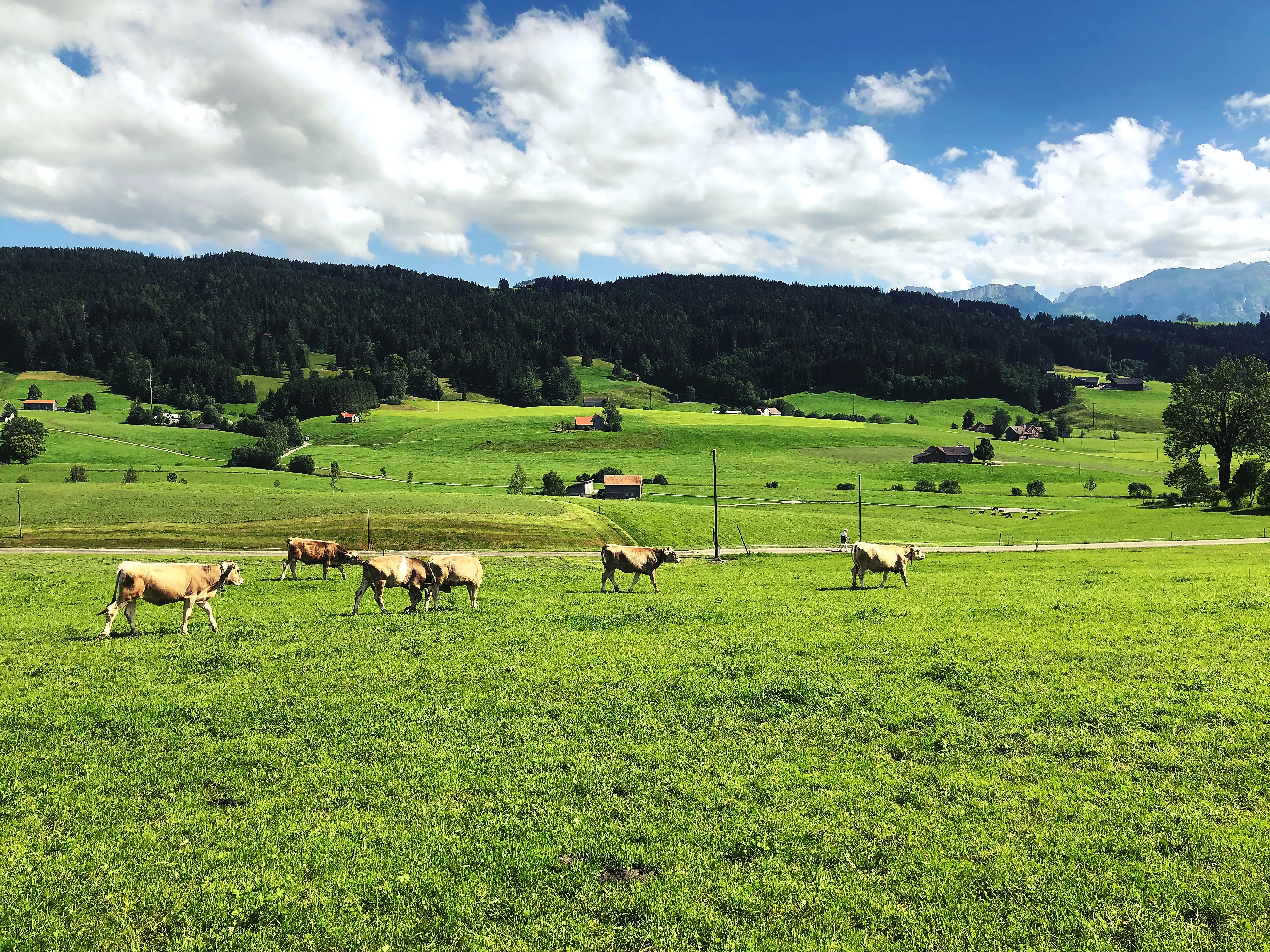 Nach einer kurzen Stärkung kehren wir zurück auf den Wanderweg, der uns wieder in ein Waldstück führt. Hier geht es direkt links hoch bis man an einen kleinen Grillplatz gelangt. An diesem Punkt folgen wir dem ausgeschilderten Weg bergab nach Rietli. Bei diesem Stück der Wanderung ist Vorsicht geboten, denn der Weg führt über verästelte Waldwege und ist gerade nach Regen ein kleines Abenteuer. Heil unten angekommen, gelangt man über die Straße Fohren zu der kleinen Bahnstation Rietli, wo wir die große Haupstraße überqueren und auf der gegenüberliegenden Seite entlang durch Wiesen an großzügigen Bauernhöfen laufen. Dieser Weg führt bis zur nächsten Haltestation Hebrig, wo wir wieder die Hauptstraße kreuzen und den Weg nach Buechen-Gais einschlagen. Für alle Zugbegeisterten bietet die Strecke zwischen Gais und dem Ort Altstätten ein weiteres Ausflugshighlight: die Zahnradbahn. Diese ist mit knallroter Lackierung nicht nur von außen ein Hingucker, sondern besitzt auch einen offenen Aussichtswagen, in welchem man die 8 Kilometer lange Strecke genießen kann. In den Sommermonaten fährt die Zahnradbahn jedes Wochenende und Mittwochnachmittag.